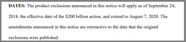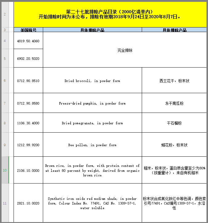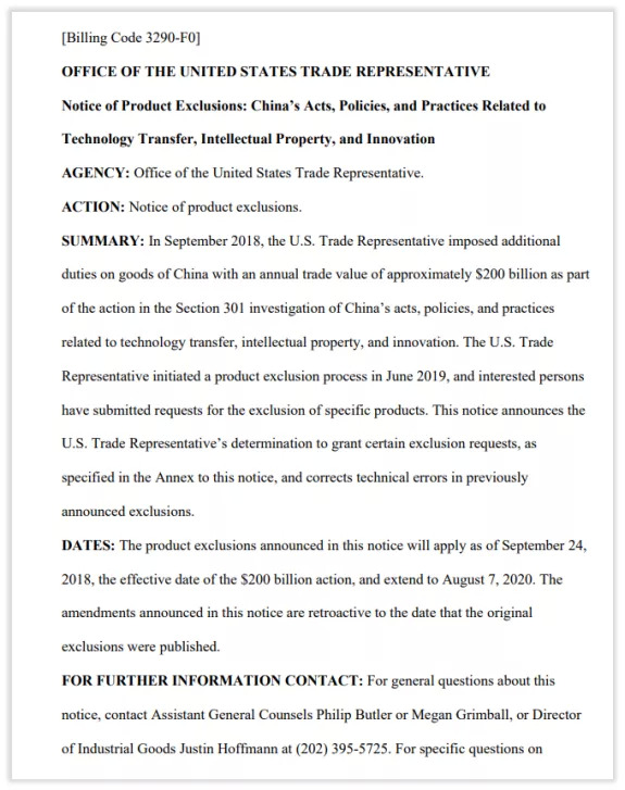 注意:本公告中宣布的产品排除加征有效期为:2018年9月24日至2020年8月7日。