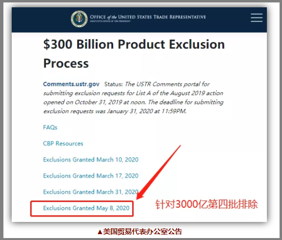 也就在前几天,当地时间5月4、8日,美贸易代表办公室(USTR)又公布了分别针对2000亿和3000亿美元中国产品加征关税的第27和28批商品排除清单。