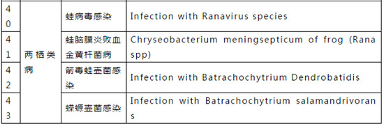 修订后的《名录》,包括水生动物疫病43种,均被列为二类进境疫病。新增了7种水生动物疫病,分别为:鲑鱼甲病毒感染、鲤浮肿病毒病、罗非鱼湖病毒病、细菌性肾病、急性肝胰腺坏死、十足目虹彩病毒1感染(虾虹彩病毒病)和蝾螈弧菌感染;删除了8种水生动物疫病,分别为:对虾杆状病毒病、斑节对虾杆状病毒病、小瓜虫病、黏孢子虫病、 指环虫病、河蟹颤抖病 、鲍脓疱病和鳖腮腺炎病。