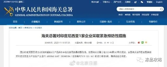 海关总署:印尼1批冻刺鲳鱼检出新冠阳性,暂停相关企业进口申报