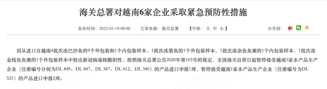 2022年01月19日海关总署发布通告:因从进口自越南4批次冻巴沙鱼的9个外包装和1个内包装样本,1批次冻墨鱼的1个外包装样本,1批次冻杂鱼鱼糜的1个内包装样本,1批次冻金线鱼鱼糜的1个外包装样本中检出新冠病毒核酸阳性。按照海关总署公告2020年第103号的规定,全国海关自即日起暂停接受越南5家水产品生产企业(注册编号分别为DL 849、DL 847、DL 347、DL 412、DL 340)的产品进口申报1周,暂停接受越南1家水产品生产企业(注册编号为DL 521)的产品进口申报2周。