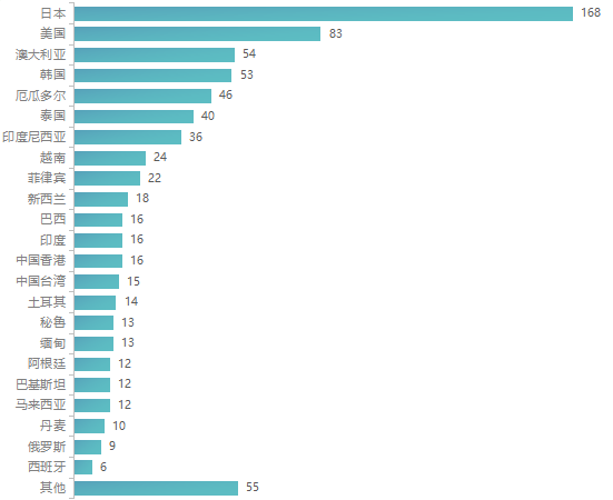 第一季度共查获来自46个国家或地区的产品不符合我国食品安全国家标准和法规要求。其中,不合格批次数较多的产品产地是日本、美国、澳大利亚、韩国、厄瓜多尔和泰国,均超40批次,详见图4。(不超过6批次的均归为其他)