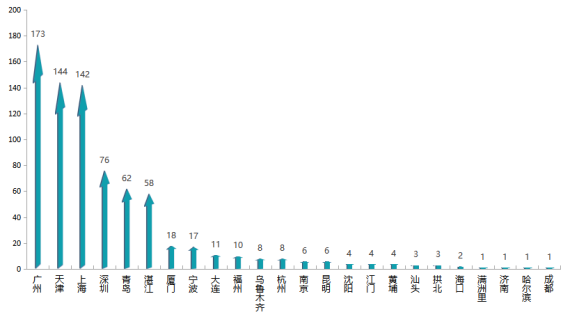 上述不合格产品进境口岸主要集中在广州、天津、上海、深圳、青岛、湛江等城市,以上城市不合格产品数量均超过50批次,各进境口岸查获不合格产品数量详见图3。