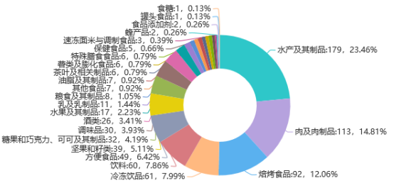 通报的进境不合格产品中水产及其制品、肉及肉制品、焙烤食品通报批次较多,分别为179批次、113批次、92批次。进境不合格产品品类占比见图1。