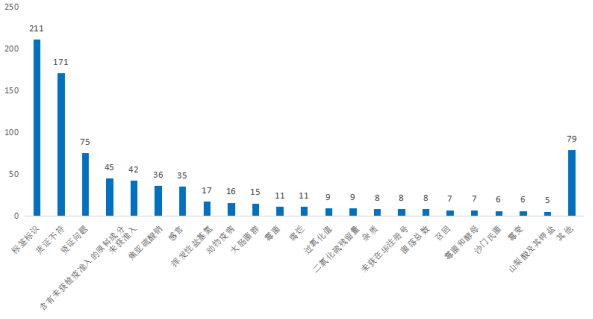 未准入境食品涉及的不合格原因主要是标签标识不规范、货证不符和资证问题,分别为211批次、171批次和75批次。详细不合格原因分类数量见图2。(低于5批次的不合格原因归为其他)
