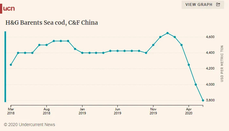 消息人士确认,近两个月真鳕与黑线鳕价格持续下跌,依不同产地,1-2公斤H&G(去头去脏)真鳕价格从年初的$4,500/t下跌至$3,650-$3,900/t,黑线鳕价格从年初的$3,600/t下跌至$2,700-2,900/t。