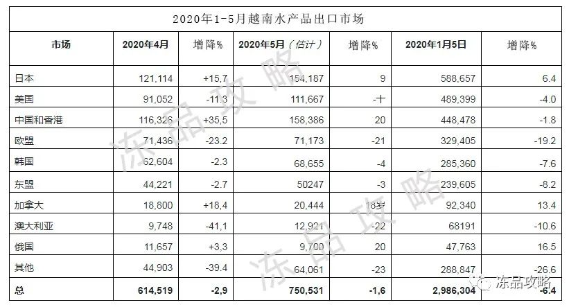 到5月底,对中国的出口同期下降约2%,到6月底,对该市场的出口结果将与2019年同期相近或略有增长,但由于近期中国北京检验出新型冠状性病毒,水产进口情况堪忧,越南水产对中国出口或将不如预期发展。日本今年将继续是越南海产品消费的最大市场,并将在欧盟和美国市场下降中占很大一部分。