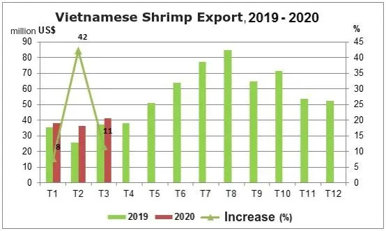 从2020年3月开始,Covid-19在全球广泛传播,尤其是美国,确诊病例高达百万,导致包括虾在内的商品向该市场的出口被推迟。由于美国政府采取的疾病控制措施,食品服务领域的消费量急剧下降,因此美国进口需求也有所下降。但是,由于美国消费者从疫情开始就急于购物增加库存,因此零售系统仍会购买商品这抵消了部分餐饮停止导致的市场份额的下降。由于国家封锁,印度,厄瓜多尔和泰国的虾供应减少,因此美国客户更多转向越南虾。