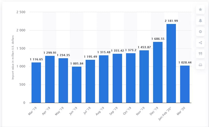 在冠状病毒爆发之前正值中国农历春节,此时正是海鲜产品消费的高峰季节,因此进口经销商以及市场批发商等商户都储备了大量库存,根据国际贸易中心的数据显示,2019年第四季度,中国进口了45.1亿美元的海产品,较上一季度增长13%,再次创下记录。