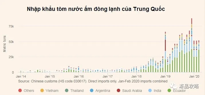 阿根廷向中国出口了3,900吨虾类产品,而越南供应了1,700吨虾类。中国还从委内瑞拉直接进口了980吨虾类产品,价值423,000美元。