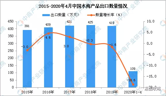 2020年初由于疫情影响各类产品出口都有所减少,2020年1-4月中国水海产品出口量为109万只,同比下降18.6%。
