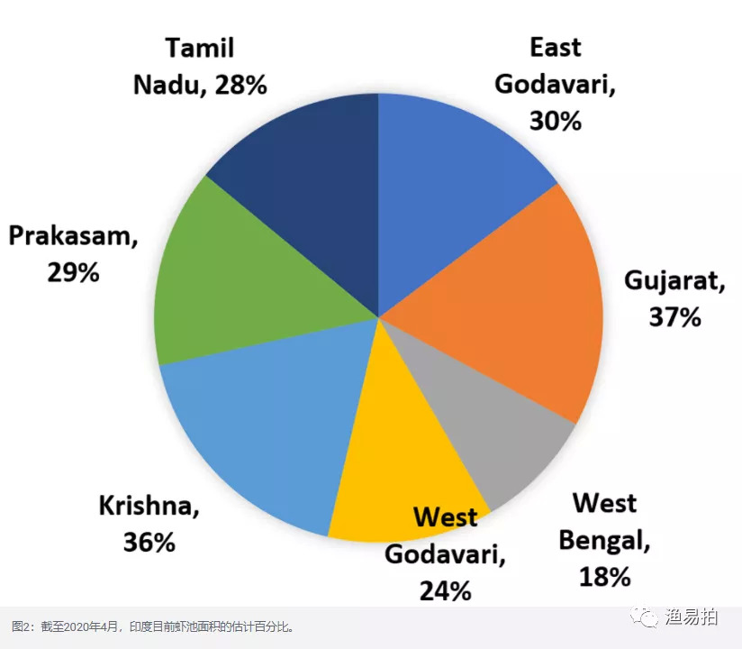 印度的虾类养殖面积目前超过17.6万公顷(公顷):大约160,000公顷(91%)用于生产太平洋白虾,约14080公顷(8%)用于黑虎虾(斑节对虾)养殖和大约1,760公顷(1%)的淡水大虾的生产。