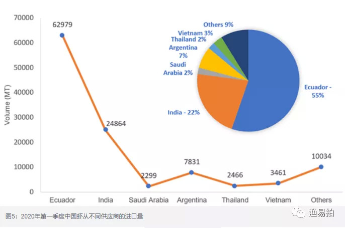 2020年第一季度印度的主要出口目的地是美国,约68,894吨,其次是对中国的24,848吨,中国从印度恢复了对虾的进口。尽管厄瓜多尔目前是中国的主要供应国,但印度在数量上仅次于它,占中国虾进口总量的22%(图4)。根据内部数据,大约有25,000吨虾被冷藏以备将来订购,安得拉邦政府通过开放主要港口Vizagapatnam,Kakinada和Krishnapatnam来支持该行业,以恢复出口。