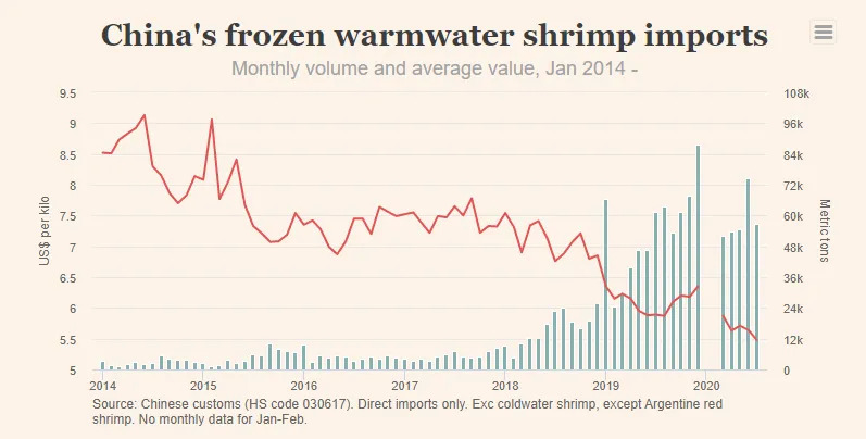 今年1-7月,中国已进口33.9万吨暖水虾,价值22.9亿美元。消息人士称,近两个月进口量有所减少,因国内虾类库存量处于较高水平。