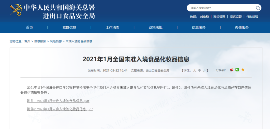 2021年1月全国海关在口岸监管环节检出安全卫生项目不合格并未准入境食品信息公布,附件所列未准入境水产品均已在口岸依法做退运或销毁处理。
