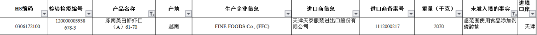 因“超限量使用食品添加剂磷酸盐”未准入境的虾类货物20.95吨。