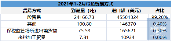 1-2月份带鱼进口贸易方式中
