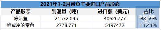1-2月份带鱼进口产品主要形式有两种,其中