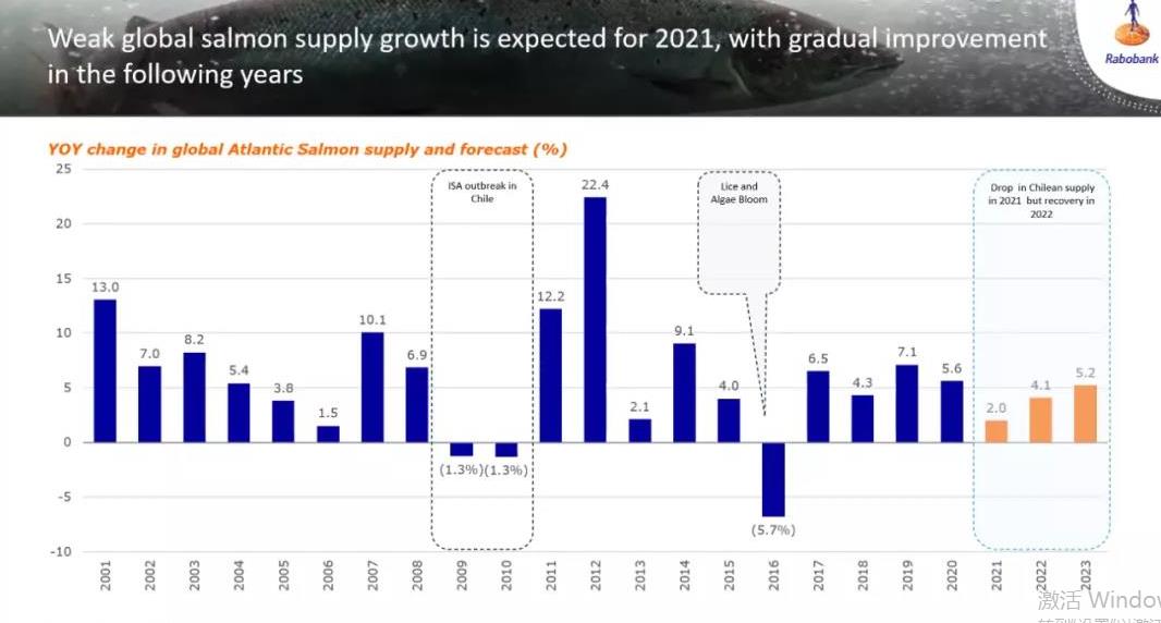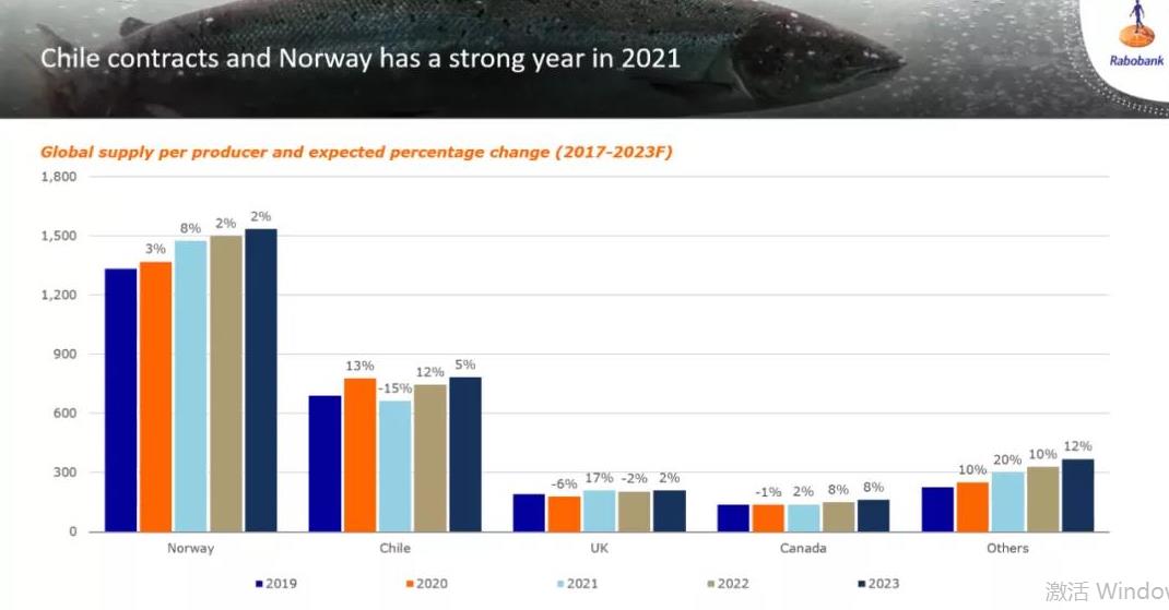 荷兰合作银行(Rabobank)高级分析师Gorjan Nikolik称,2021年智利三文鱼产量的下降恰好由挪威的增长部分填补,全球其他产区增量较少,今年的总产量仅比去年增长2%左右。