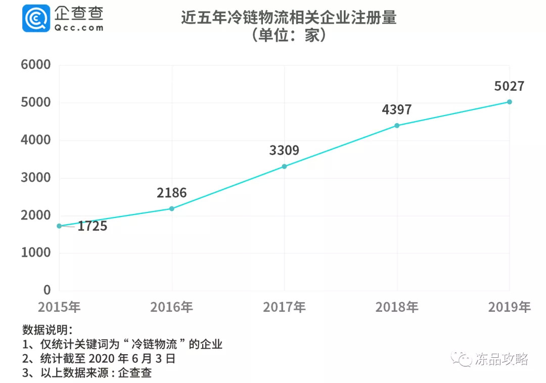 2020年5月1日,我国进入今年的休渔期,对海水捕捞产品供给影响稍大,同时淡水鱼进入生长期,供应也进入尾声。节气和假期拉动了消费,水产品需求有所上升,但温度的升高也影响了养殖、运输,为了能保证给居民基本的供给,冷链运输逐渐出现。企查查数据显示,我国冷链运输相关企业总量为2.5万家,在业存续企业有2.2万家。近五年相关企业数量呈直线上升趋势,2019年企业数量破5000,较五年前同比上升了191%。