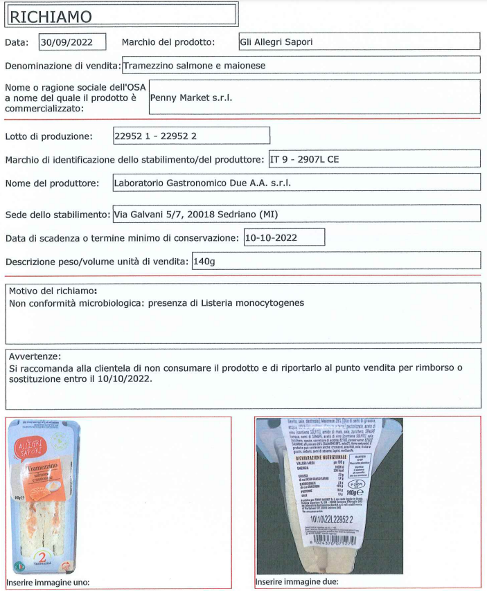 4日,意大利卫生部发布紧急召回文件,称因在Gli Allegri Sapori牌三文鱼蛋黄酱三明治中检测出李斯特菌,因此对部分产品进行召回。