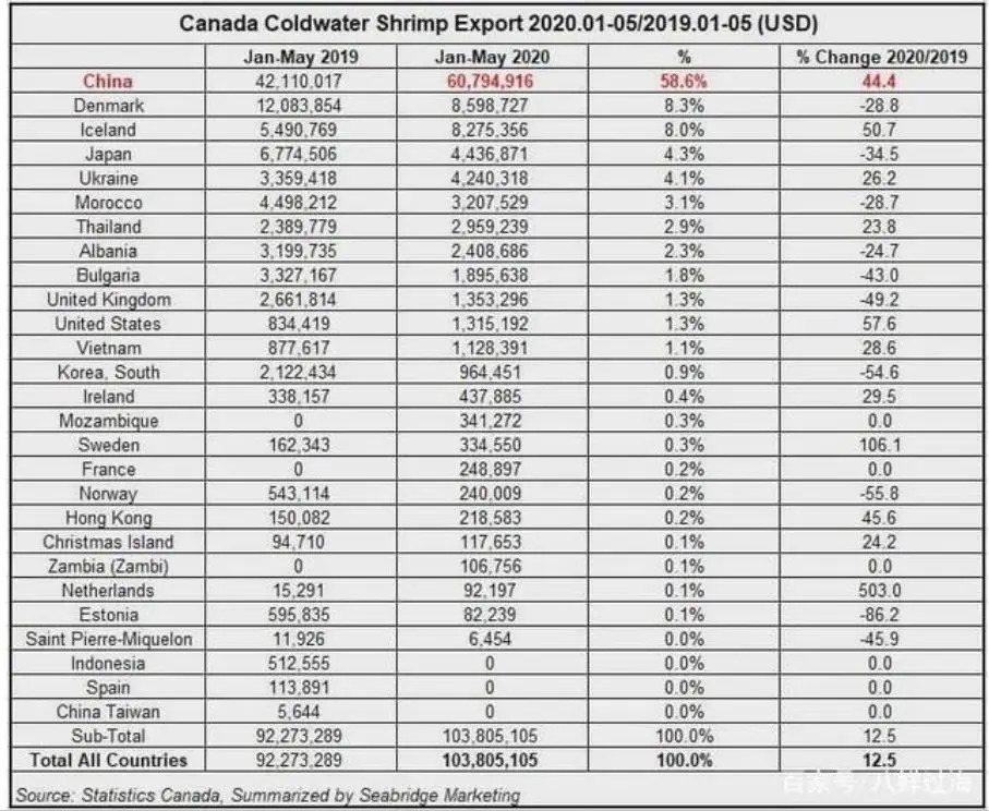 2020年5月,中国一共进口了5716吨冷冻北极虾,与去年同期的3287吨相比,猛增74%。其中,2020年5月,中国从加拿大进口的冷冻北极虾为2996吨,与去年同期的1693吨相比,逆势增长77%。
