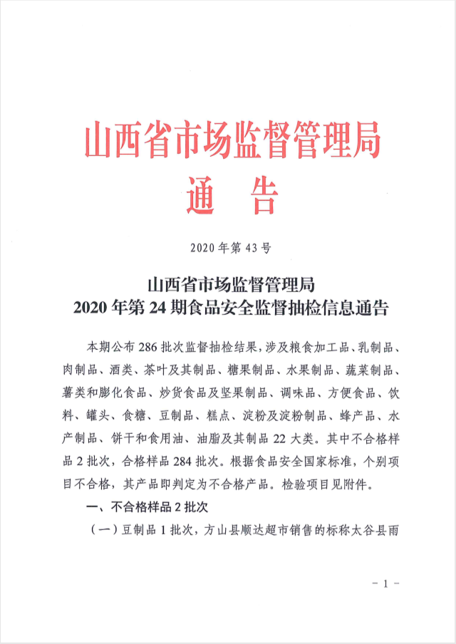 山西省市场监督管理局2020年第24期食品安全监督抽检信息通告